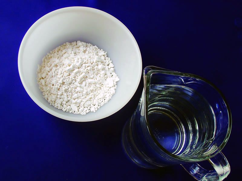2 Als nächstes wiegt ihr 100 g Wäschestärke mithilfe der Waage und der kleinen Schüssel ab und gebt sie in die große Schüssel. Wer keine Waage hat, kann einfach 5 gehäufte Esslöffel Stärke nehmen, das ergibt auch etwa 100 g.