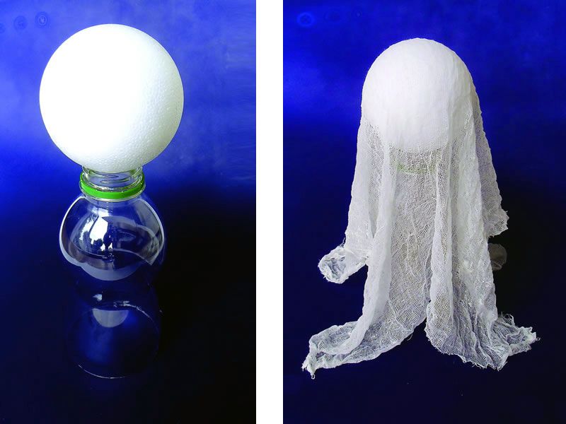 Dann breitet ihr den Mull aus und legt ihn vorsichtig mittig über die Kugel auf der Flasche. Nun könnt ihr noch die Falten in die richtige Form bringen. Der Geist muss ca. 2 bis 3 Stunden trocknen.